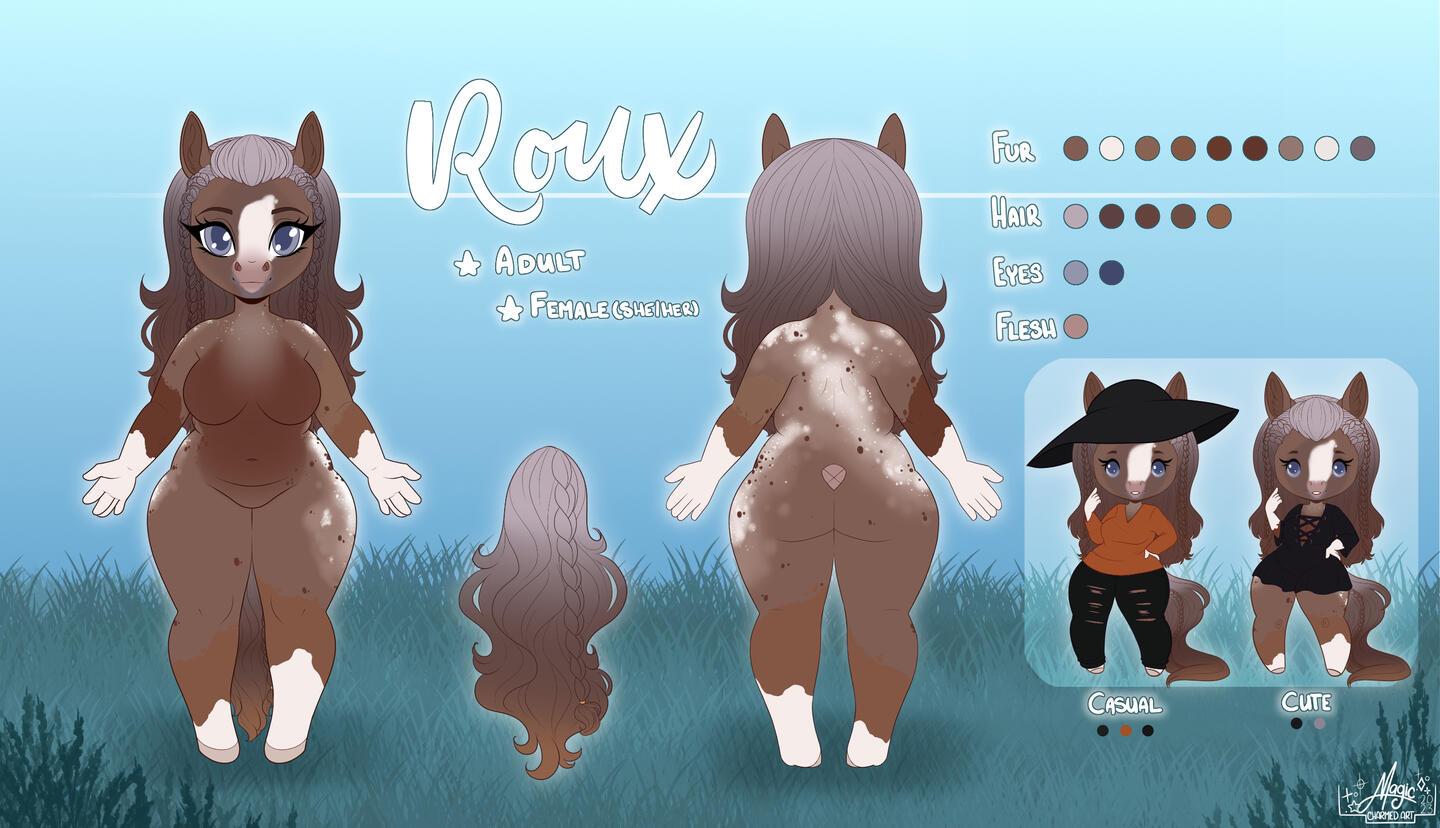 A full ref comes with a full body front view, and a full body back view, lined and colored, with a name, info about the character, and a color palette.